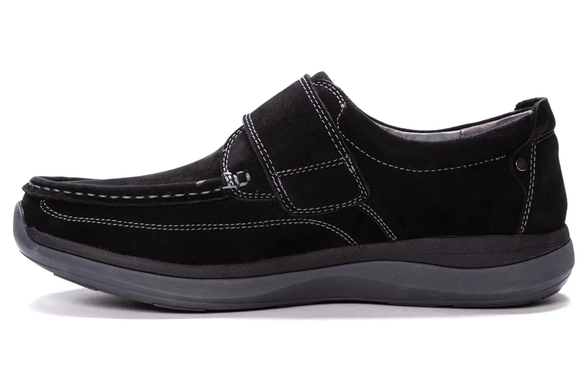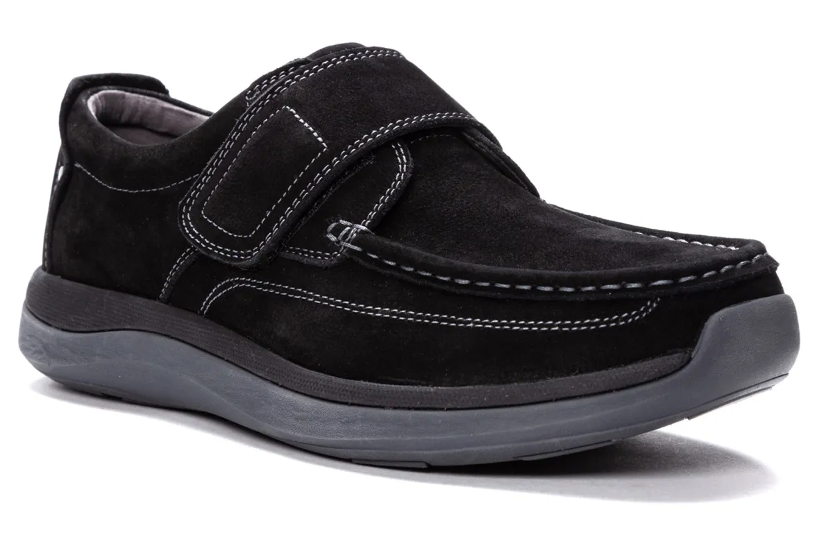 Propet Porter is a sturdy shoe with traditional moc styling. Features include a nubuck upper, mesh lining, removable footbed, open cell insole and EVA outsole. A hook and loop strap closure secures feet and a 1-inch platform heel elevates these stylish loafers.