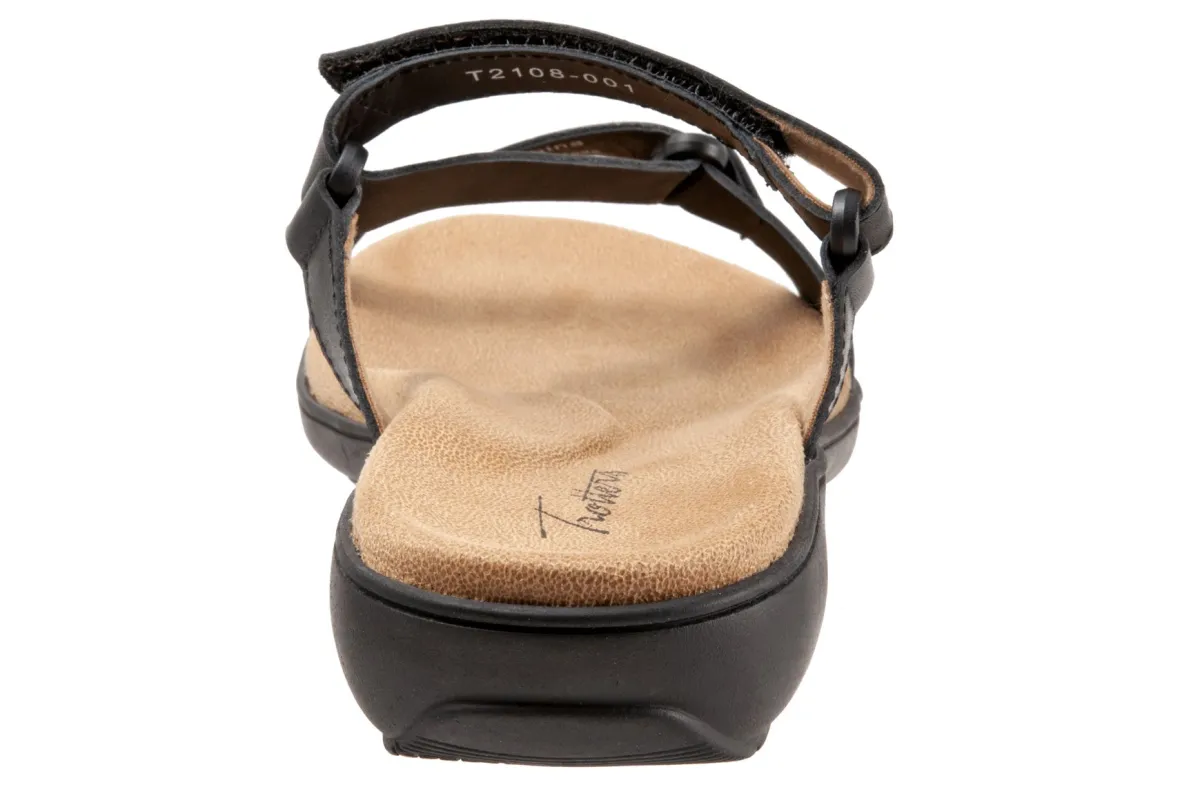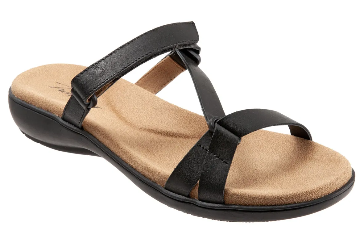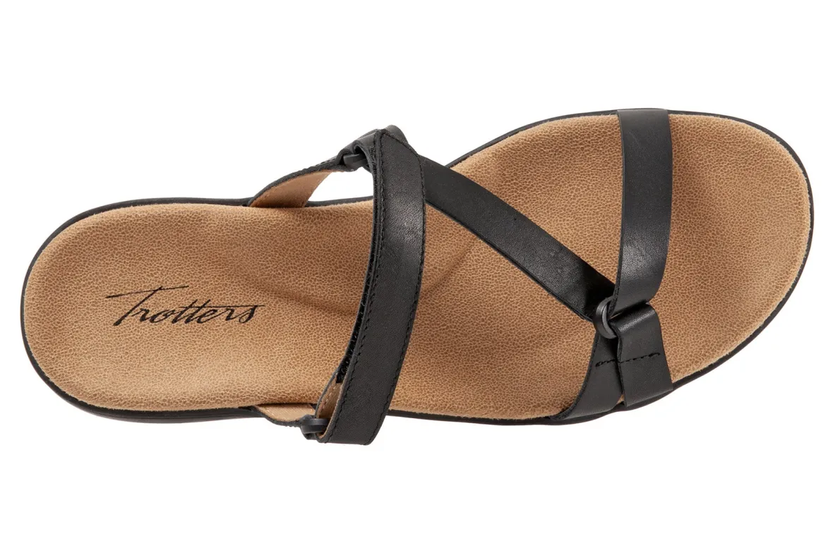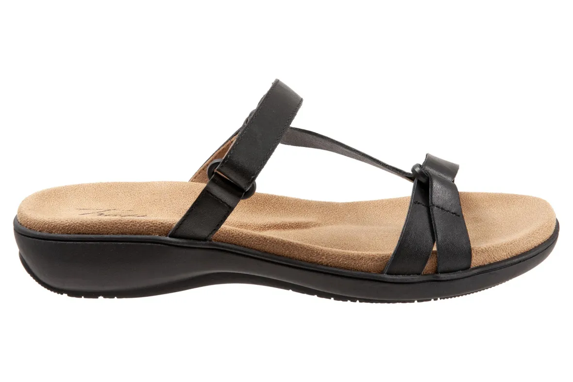 Trotters Raja is a classy and comfy slide sandal. These summer sandals have leather uppers, memory foam and EVA footbed and lightweight rubberized outsole. Adjustable hook and loop straps, soft microfiber footbed lining and 1 ¼ inch heel height makes this silhouette a warm weather favorite.
