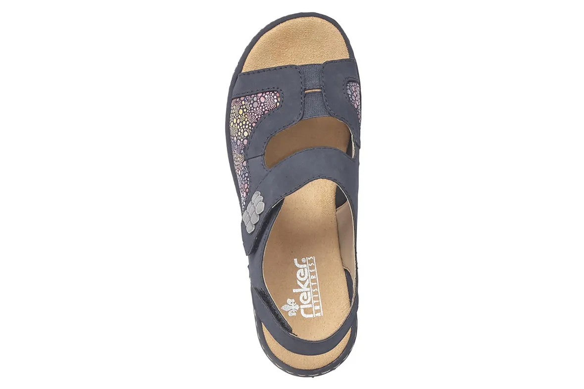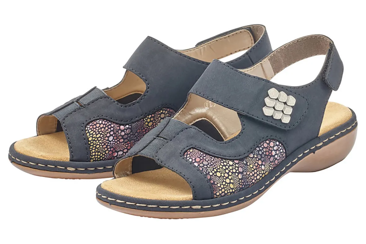 Rieker Regina 89 is a lightweight and comfortable women’s sandal. Elastic forefoot strap and 2 adjustable ankle straps provide stability and support. An intricate faux leather upper with trendy embellishments complete this chic design.