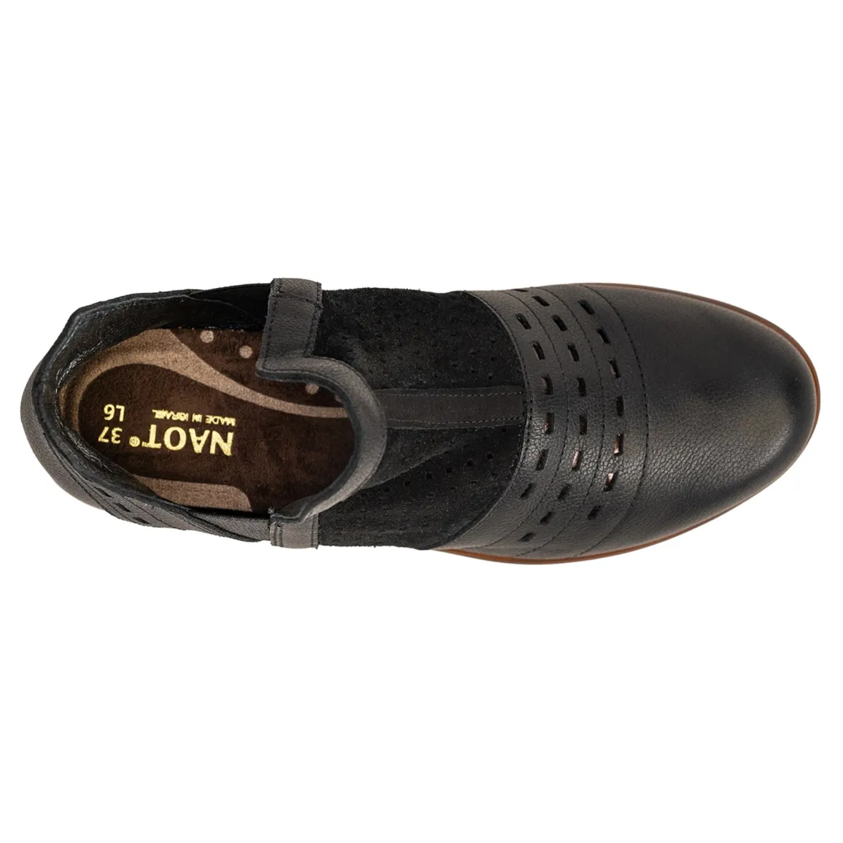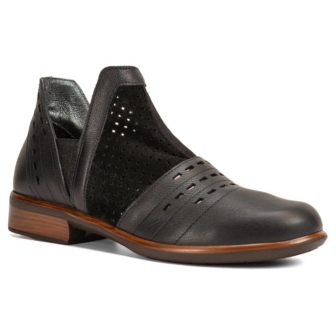A beautiful ankle boot with contrasting materials and perforated designs, the Rivtotra is perfect for transitional wear. The Rivotra comes with Naot’s removable, anatomic cork & latex footbed for all day comfort. The Aura Collection features a 1.5″ polyurethane sole with a metal shank which is extremely lightweight
