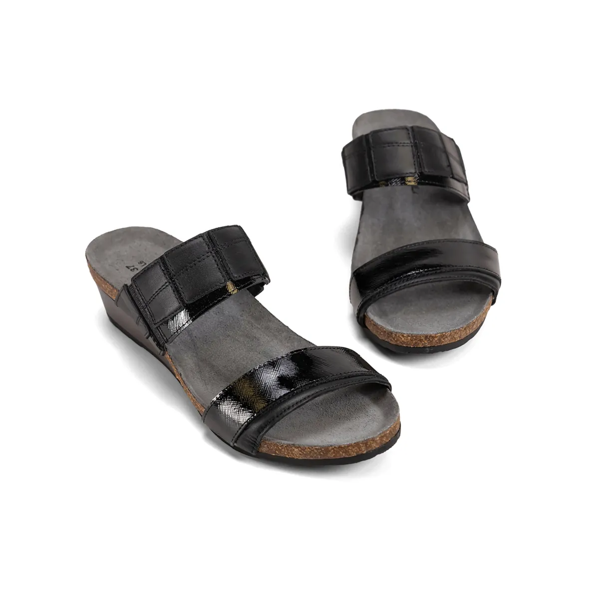Naot Royalty is a dressy slide with a sleek design. An anatomic cork and latex footbed is wrapped in suede and molds to …