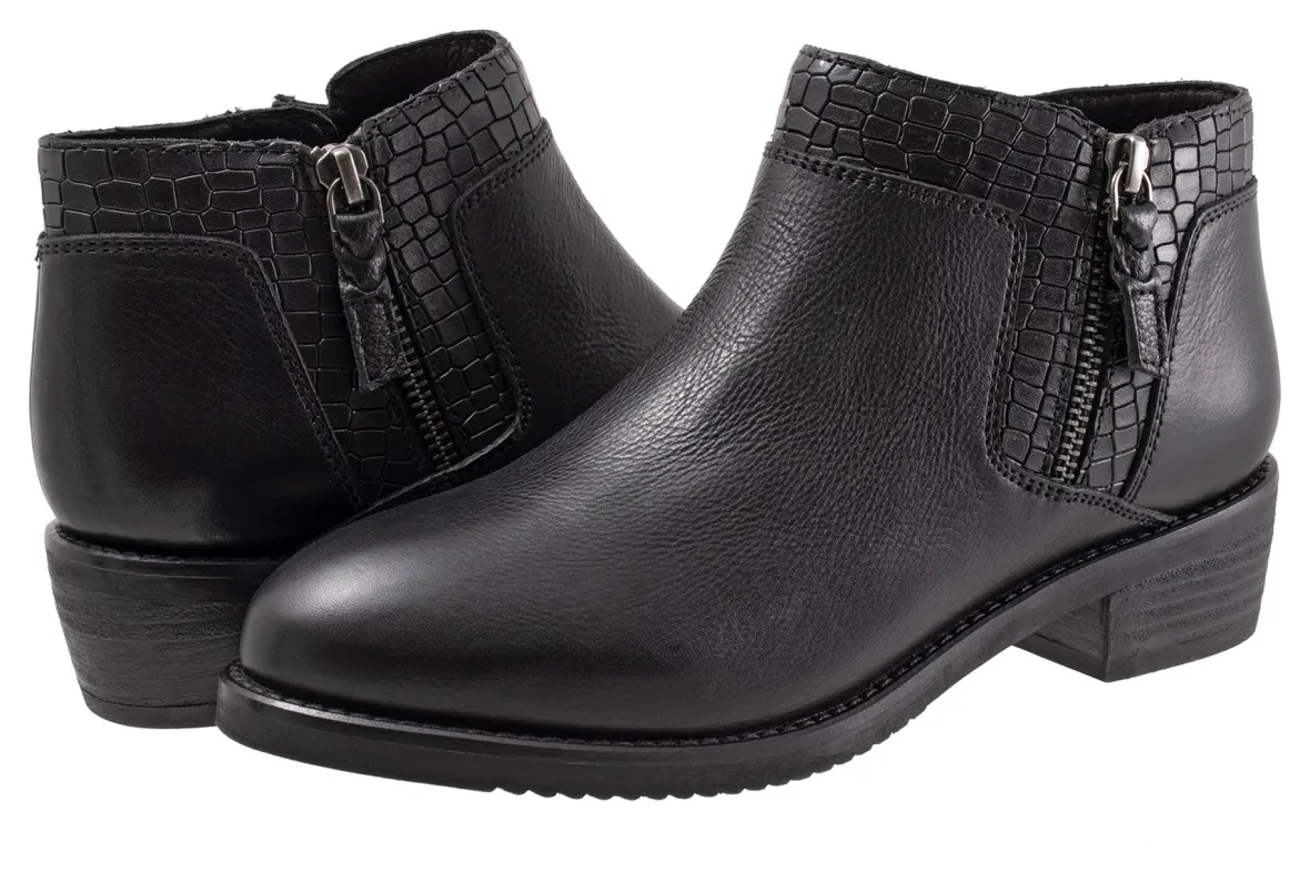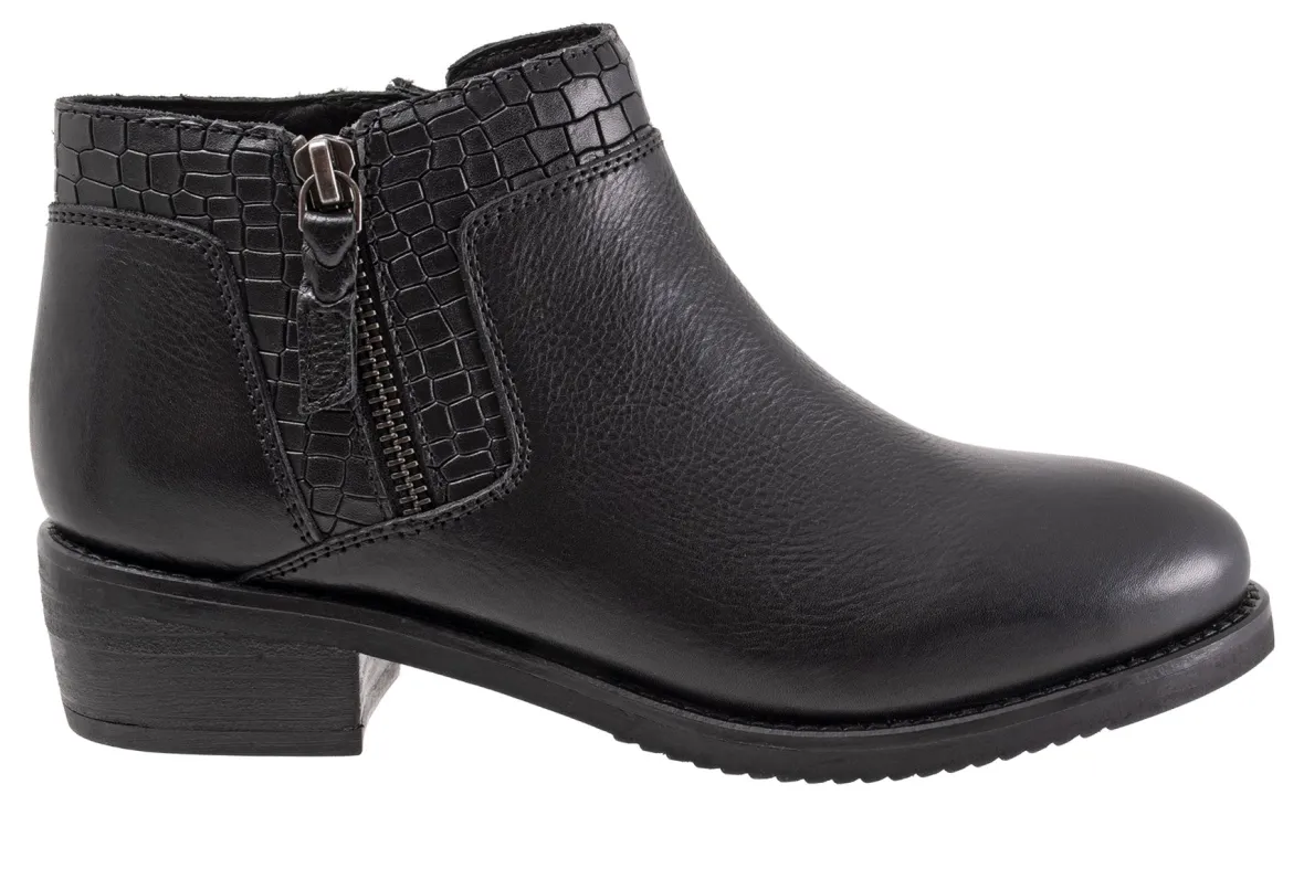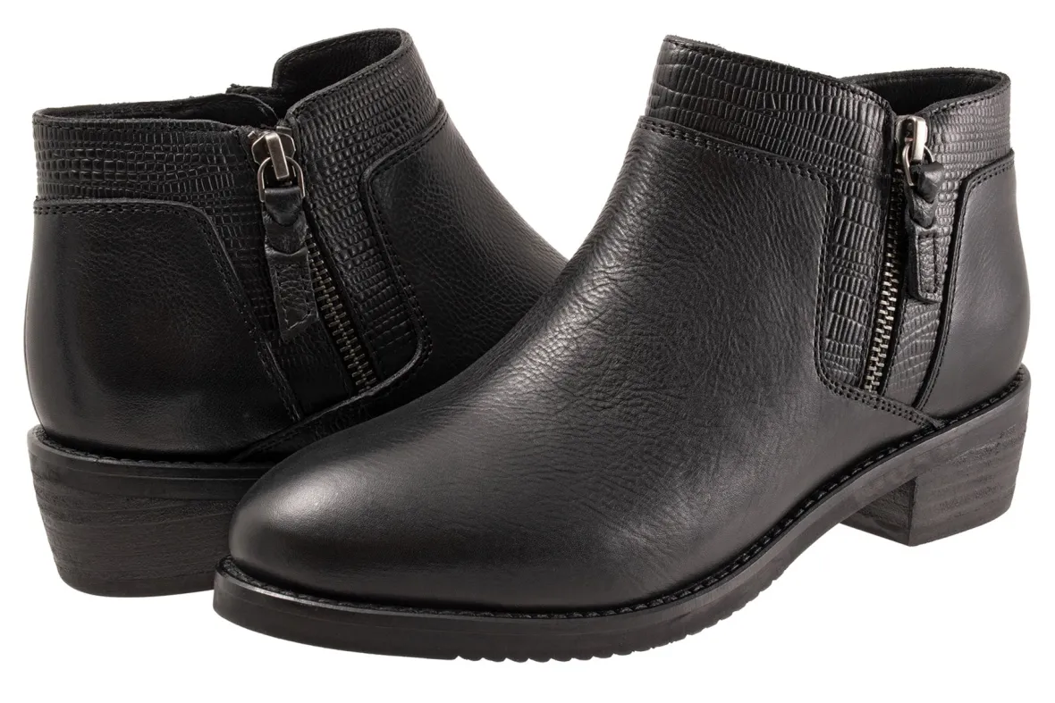 Softwalk Rubi is a comfortable and stylish ankle boot. These cold weather shoes have leather uppers, a cushioned removable footbed and rubberized outsole. A microfiber lining, dual zippers and a 1 ¼ inch stacked heel height will make these boots a wardrobe staple.