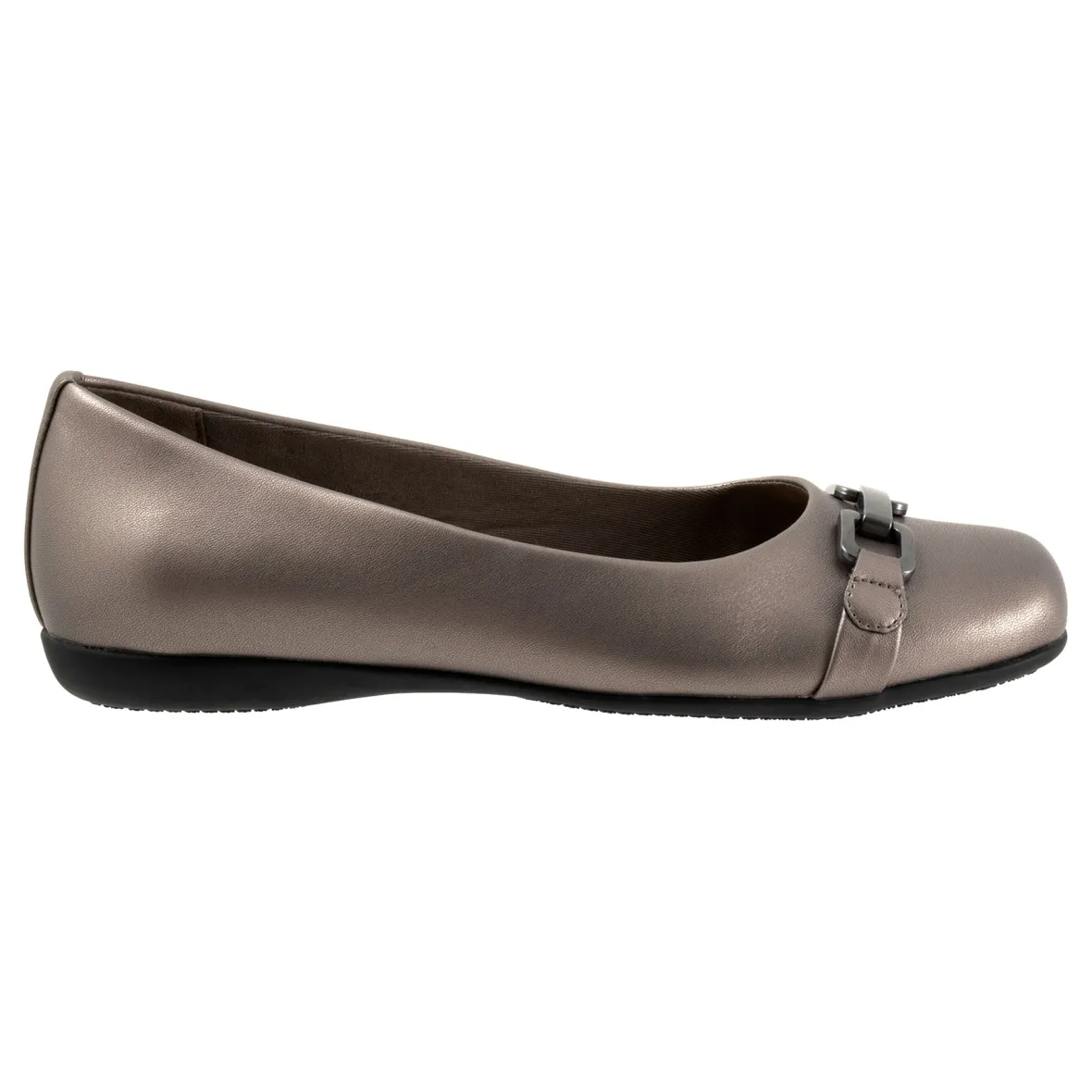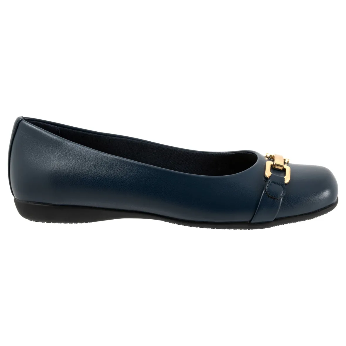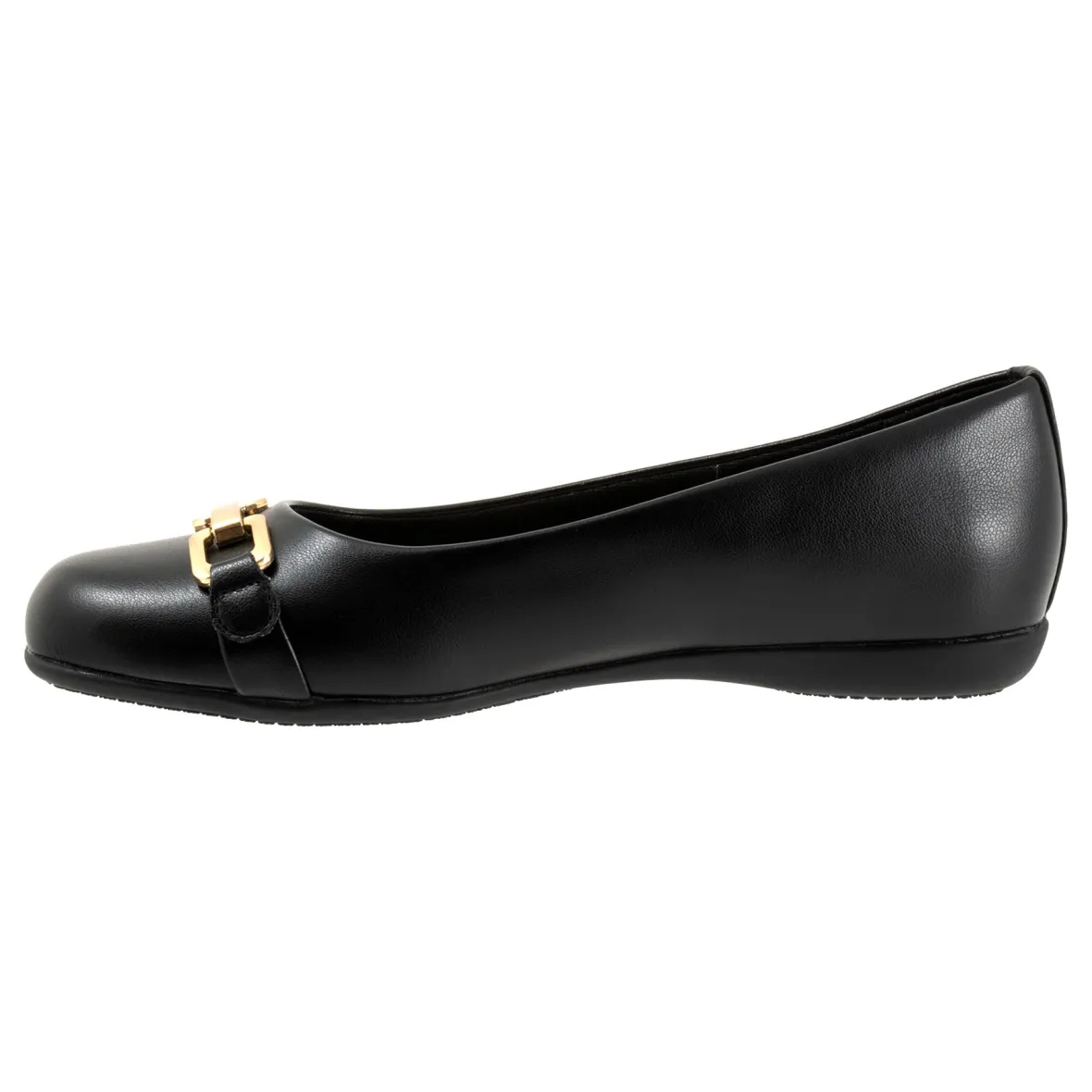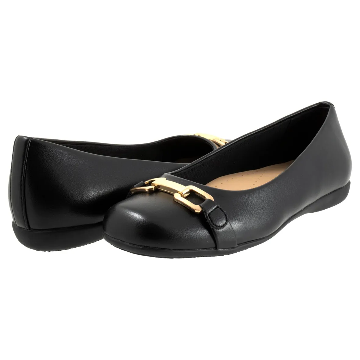 The Sadie flat adds a touch of class with a classy tailored buckle detail. The removable footbed is cushioned and has arch support and the long-wearing sole is based from a Trotters best seller.