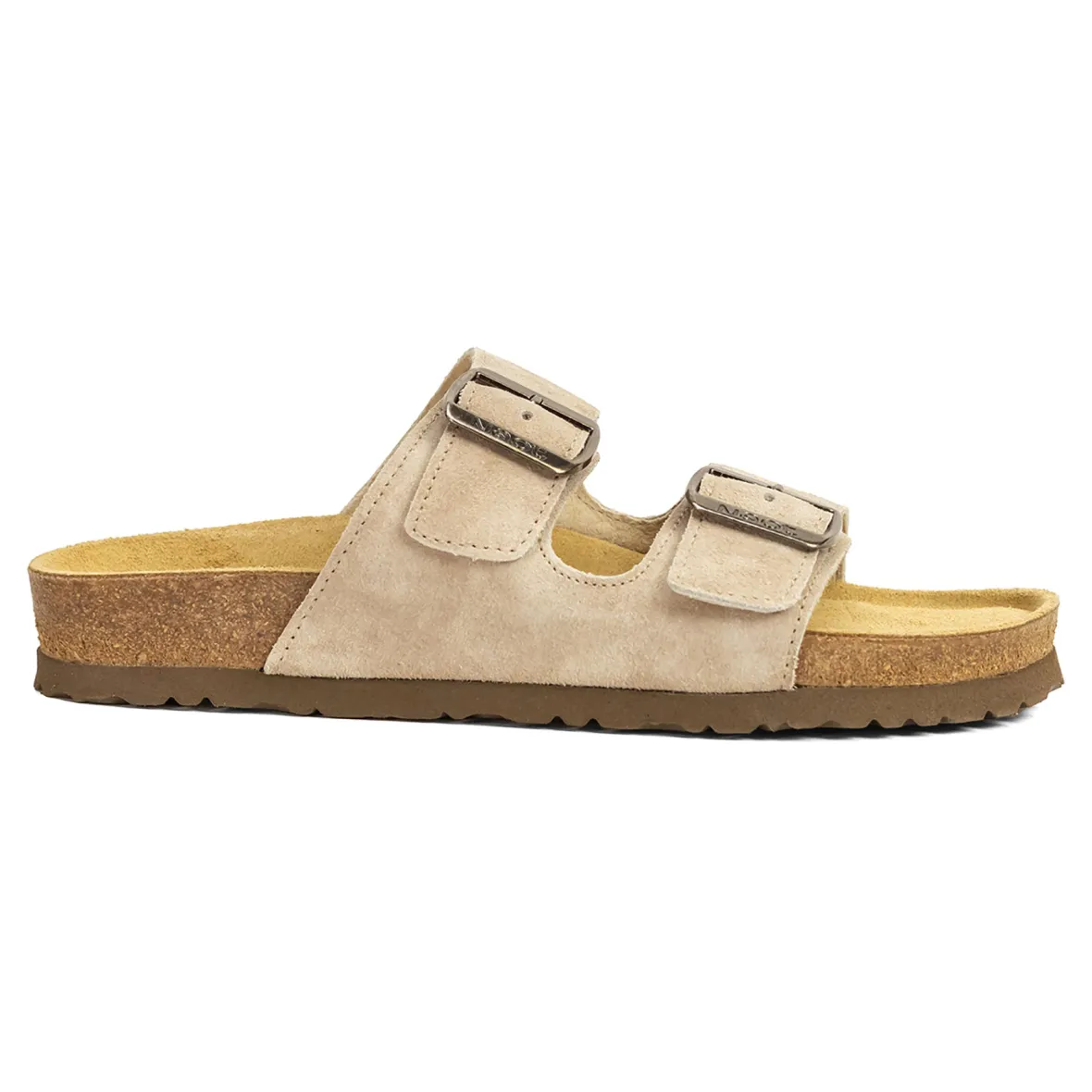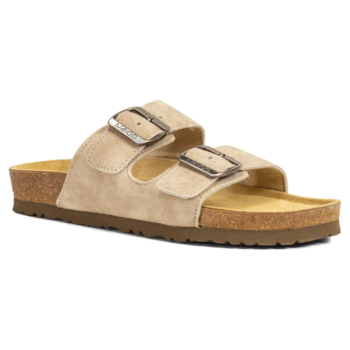 Suede leather upper with two adjustable buckle closures.