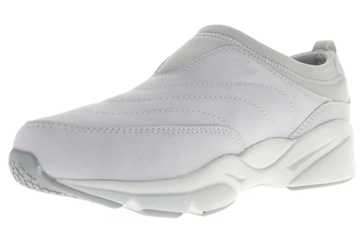Leather or Nubuck slip-on with center gore and a roomy toe box providing toes space to spread out improving stability. Soft cushioning PU for even wear with comfort ridges in the forefoot and memory foam topper. Supportive EVA midsole with rubber outsole for a long-lasting smooth stride. Slip Resistant, Scotchgard™ stain and water resistant treatment.