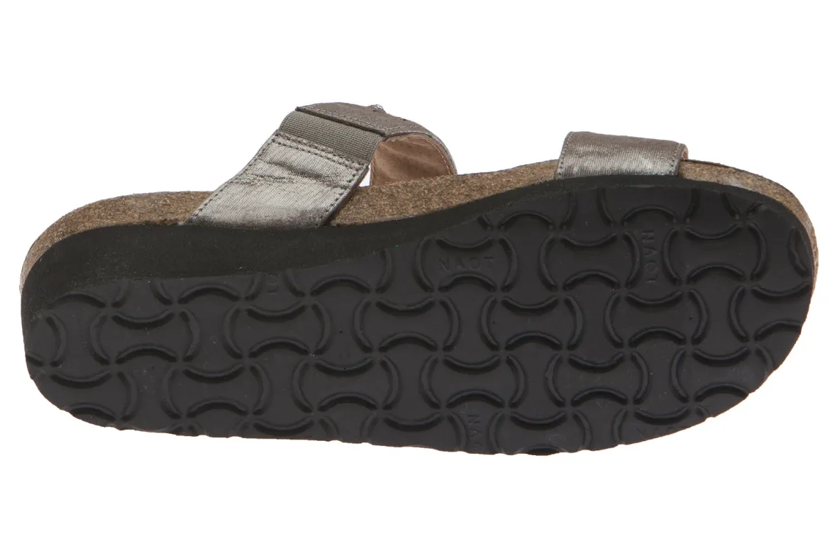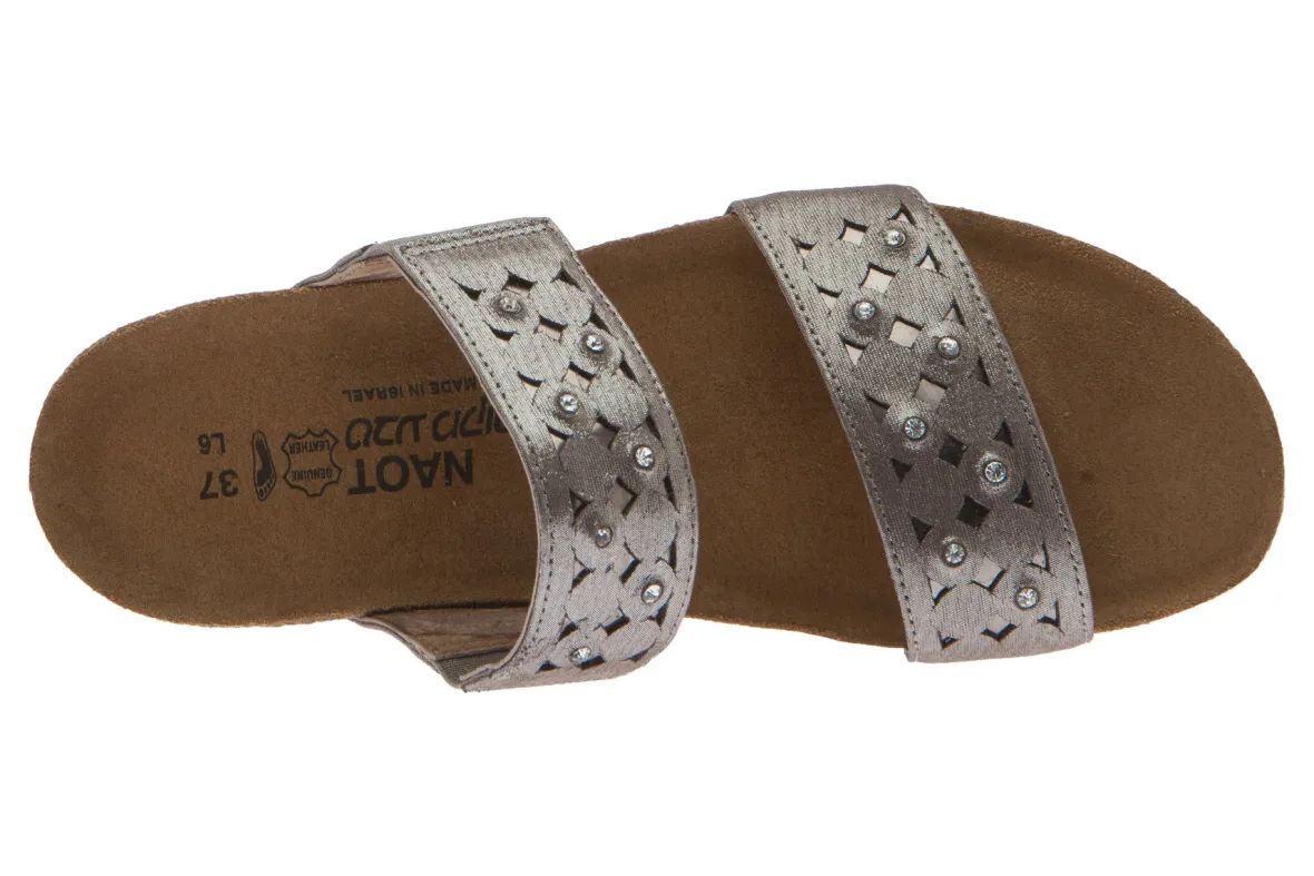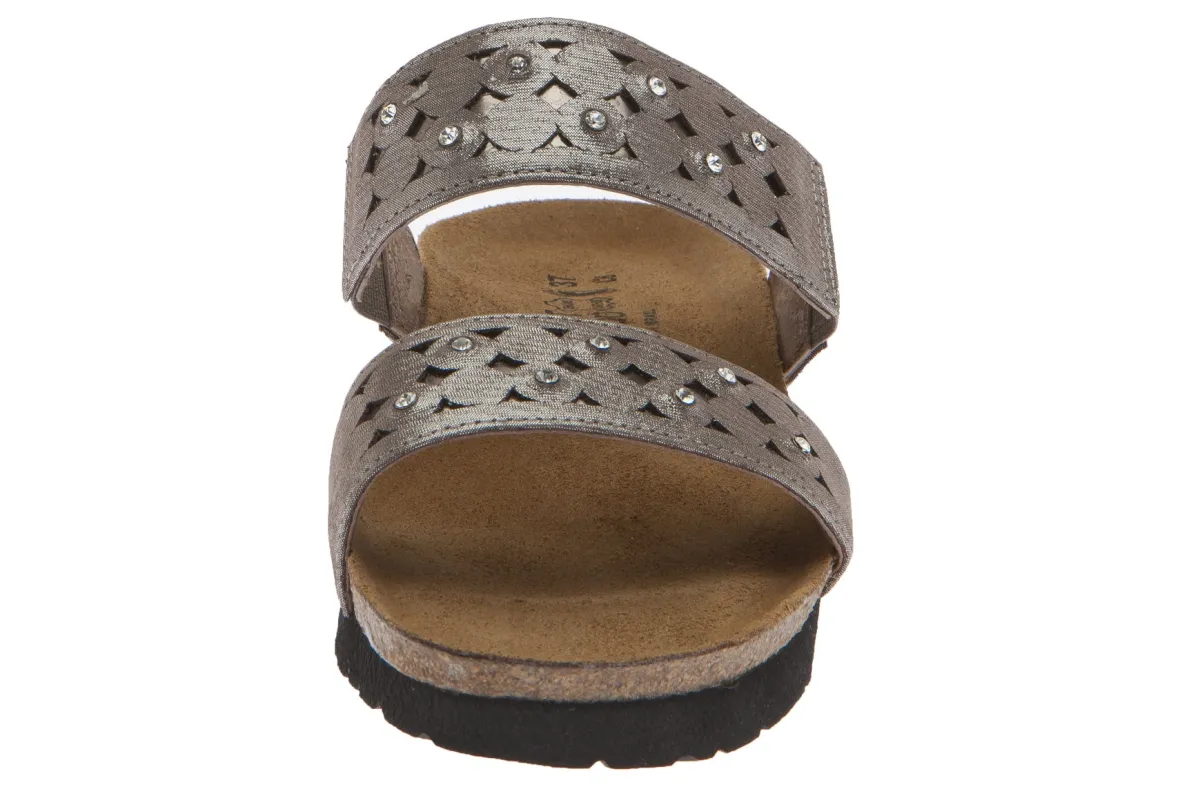 Step into breezy comfort with the women’s Naot Susan wedge slide. Embellished with rhinestone accents and cutout designs, the fashionable sandal features a double goring detail at the instep for a more secure and comfortable fit.American Podiatric Medical Association (APMA) Accepted for promoting good foot health.Leather upper with double elastic gore panels at the instep for a more secure fit.Breathable leather lining.Cork and latex footbed provides arch support.EVA outsole is durable and provides traction.Heel Height: 1½ inches4455 BRASS LEATHER-GLASS GOLD