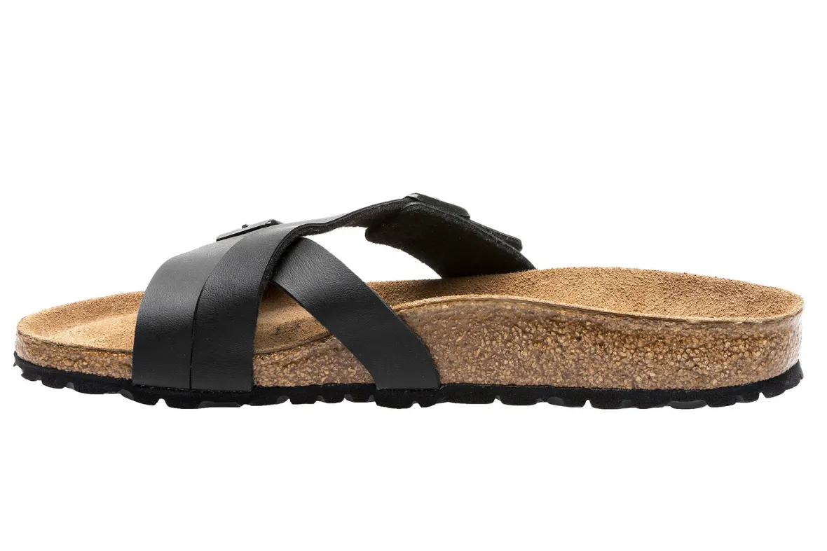 Birkenstock Yao is a trendy asymmetric slide sandal. A comfortable cork and latex footbed contours to feet and a shock-absorbing EVA outsole adds traction. These warm weather sandals have a synthetic Birko-Flor® upper and neutral heel cup that cradles feet and distributes weight.